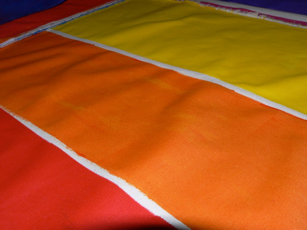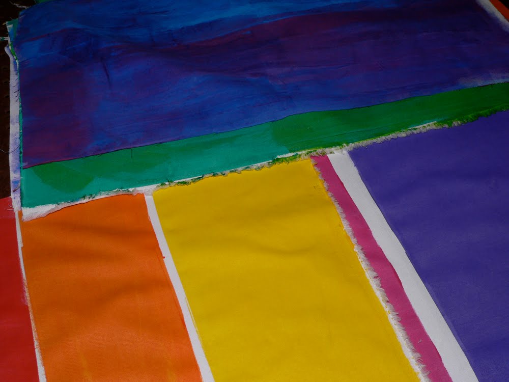 Just a couple of prints that I did yesterday, a very loooong day of printing but a very good day. I like to put down various patterns and blocks of color onto the fabric before I come back and print with the screens of my illustrations. It jazzes up the images and creates original works of art when I sew them into different pieces.
