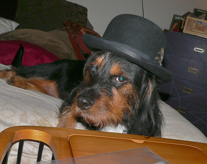 But I took a quick break yesterday to take our very handsome yet very honorary terrier mix (Dunkin) to the vet yesterday, and I was informed by our wonderful long time vet that the boy needed to go on a diet.  He's a HEFTY 60lbs. now.  Dunkin is our rescue dog that we got from the pound when he was 3 months old, he's almost 6.5 years old now.  When we got him they said that he was 10 months old and that he was a dachshund mix. Yeah, I had always wanted a Dachsund.  He was 10lbs at the time so he wasn't suppose to have grown that much more, maybe he would get to 15-20lbs.  Well he surpassed that a long time ago, and now we have what looks to be a Basset/Terrier mix (we still love him tons though)... not really sure except that he now weighs a chunky monkey weight of 60lbs.  The boy has been put on a restricted low calorie food diet with plenty of green beans to keep him happy with his binge eating, plenty of walks during the day and hopefully I'll get him back down to under 55lbs.  He can do it he's the Dunk!  Maybe I'll make him wear that hat when we go for our walks.  LOL!