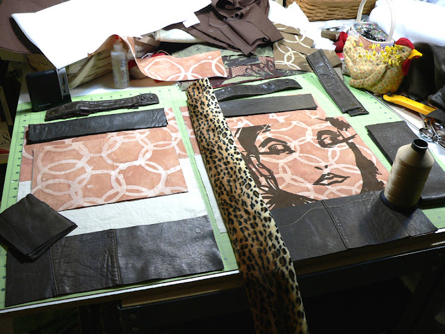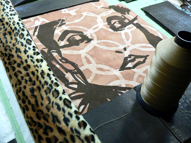 I was up kinda late last night designing, cutting and laying out a new bag design using my silkscreened fabrics, leather, and a sassy faux leopard skin fur print. As always I just love the layering of textures and patterns in my work, it's exciting, tactile and just fun to look at, as well as, put together.